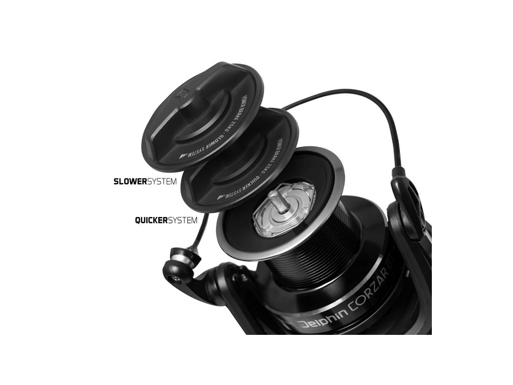 CORZAR patrí do rodiny veľkokapacitných kaprárskych navijakov z dielne firmy Delphin, ktorý vyniká svojím, do detailov prepracovaným dizajnom. Jeho základ tvorí masívna noha prechádzajúca do tela vyhotoveného z veľmi pevného a odolného plastu. Vnútri navijaku sa ukrýva šnekový prevod, ktorý v kombinácií s guličkovými ložiskami (6+1) zabezpečuje bezproblémový plynulý chod a dlhú životnosť. CORZAR je osadený takzvanou “power“ brzdou, ktorá disponuje brzdnou silou až úctyhodných 25 kg a ktorú navyše dostávate k navijaku v dvoch prevedeniach. Brzda s označením “Quicker system“ umožňuje ju naplno utiahnuť jedným pootočením, zatiaľ čo pri “Slower system“ je brzdenie unikajúcej ryby podstatne jemnejšie a pomalšie. Spolu s anti-reverz systémom tak ponúka CORZAR široké spektrum možností nastavenia sily pri zdolávaní ryby. Devízou navijaku je taktiež nahadzovacia poistka, ktorá pri odklopenom oblúku v určitej polohe zabraňuje neželanému pretočeniu hlavy a prípadnému utrhnutiu vlasca počas nahadzovania. Kovová cievka pojme dostatočne veľké množstvo vlasca, čo z neho robí naozaj všestranný navijak pre všetky typy vôd. V balení navyše dostanete okrem dvoch bŕzd aj dve náhradné skrutky na upevnenie kľučky.