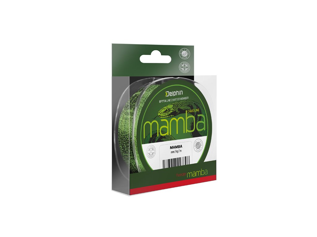 Excelentný feedrový vlasec s unikátnym 3D vzorom. MAMBA disponuje vynikajúcimi vlastnosťami ako pevnosť v uzle, či vysoká nosnosť. Vďaka svojmu jedinečnému kamuflážovému prevedeniu rýchlo splynie s okolitým prostredím. Jeho mimoriadne hladký a jemný povrch umožňuje využitie pri ďalekom nahadzovaní. Vďaka týmto vlastnostiam je Delphin MAMBA považovaný za výborný univerzálny vlasec, na ktorý sa môžete spoľahnúť v každej situácii. MM/LBS: