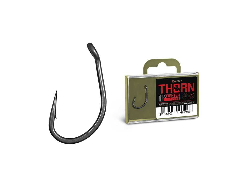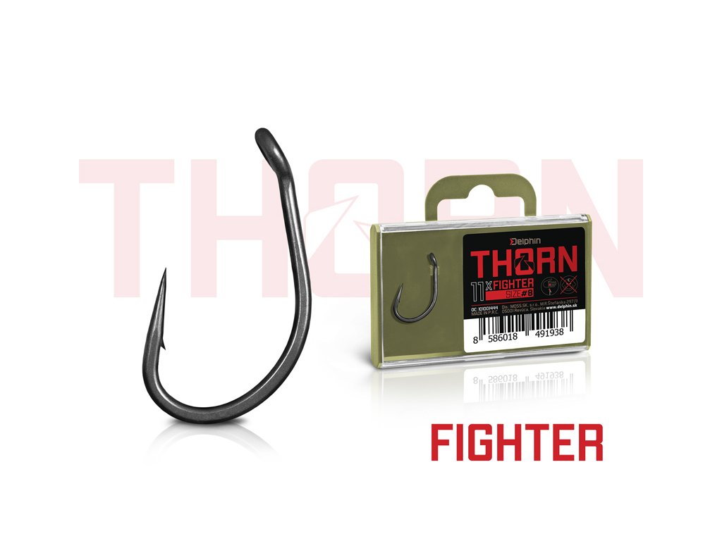 Delphin THORN je prémiová rada kaprárskych háčikov najvyššej kvality. Vďaka moderným technológiám, ktoré boli použité pri výrobe sú tieto háčiky synonymom nekompromisnej pevnosti a maximálnej ostrosti. Háčiky zo série THORN disponujú titanX povrchovou úpravou, čím nadobúdajú matný šedý povrch, ktorý je navyše dokonale hladký pre ľahké preniknutie do kaprej tlamy. TitanX sa stará taktiež o spevnenie a odolnosť celého háčika. Pomocou aplikovanej technológie Ultrapoint 4.8, bolo možné vytvoriť dlhší hrot, ktorý poskytuje priam neuveriteľnú ostrosť. Háčiky Delphin THORN sú balené v praktickej krabičke, v ktorej bude ich ostrie vždy dôkladne chránené. Na krabičke sa navyše nachádza držiak s očkom na zavesenie do predajní, ktorý je možné poľahky odstrániť odlomením bez akéhokoľvek nástroja, vďaka čomu krabička vo vašej výbave zaberie podstatne menej miesta. THORN Fighter je nekompromisný háčik, určený do tých najťažších podmienok. Vďaka hrubému drôtu, z ktorého je vyrobený má excelentnú pevnosť, ktorá ho predurčuje pre použitie vo vodách plných prekážok, či na riekach. S Fighterom na vás čakajú tie najväčšie výzvy, pri ktorých si môžete byť istý, že žiadny súboj nie je vopred prehraný. Technický parameter: háčik osovo zakrivený