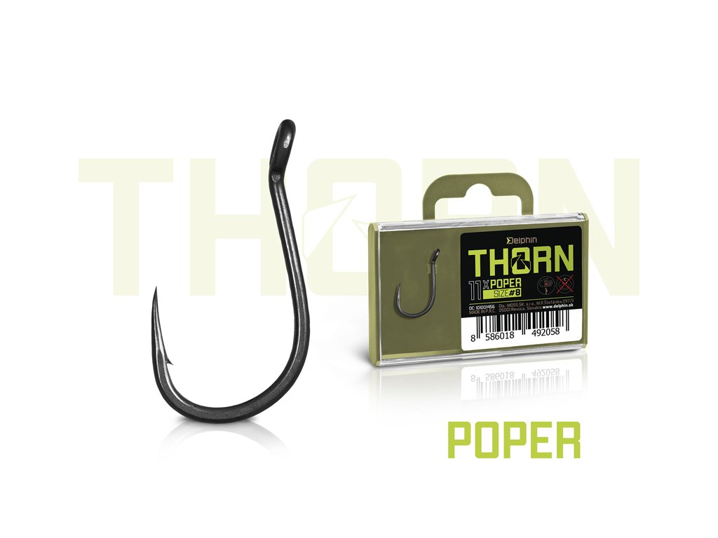 Delphin THORN je prémiová rada kaprárskych háčikov najvyššej kvality. Vďaka moderným technológiám, ktoré boli použité pri výrobe sú tieto háčiky synonymom nekompromisnej pevnosti a maximálnej ostrosti. Háčiky zo série THORN disponujú titanX povrchovou úpravou, čím nadobúdajú matný šedý povrch, ktorý je navyše dokonale hladký pre ľahké preniknutie do kaprej tlamy. TitanX sa stará taktiež o spevnenie a odolnosť celého háčika. Pomocou aplikovanej technológie Ultrapoint 4.8, bolo možné vytvoriť dlhší hrot, ktorý poskytuje priam neuveriteľnú ostrosť. Háčiky Delphin THORN sú balené v praktickej krabičke, v ktorej bude ich ostrie vždy dôkladne chránené. Na krabičke sa navyše nachádza držiak s očkom na zavesenie do predajní, ktorý je možné poľahky odstrániť odlomením bez akéhokoľvek nástroja, vďaka čomu krabička vo vašej výbave zaberie podstatne menej miesta. THORN Poper je háčik špecifický očkom vyhnutým do vonkajšej strany. Takéto prevedenie ho predurčuje predovšetkým na použitie s pop-up nástrahami. Výborne sa hodí na tvorbu montáži ako Chod rig, Multi rig, Zig rig a podobne. Vďaka miernemu zakriveniu hrotu do vnútra bude po záseku dokonale sedieť v kaprej tlame. Technický parameter: háčik osovo rovný| Kategória: | Háčik s očkom |