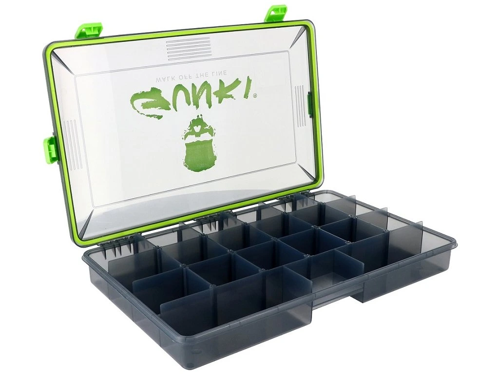Vodotesná krabička na nástrahy s nastaviteľnými priehradkami. Vhodná predovšetkým do lode alebo na bellyboat. Tmavá farba chráni nástrahy pred UV žiarením.