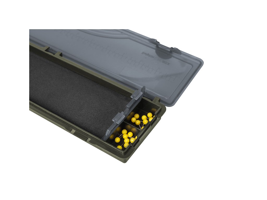 Veľmi praktický pevný peračník Delphin C-RIGBOX na kaprárske nadväzce. Vo vnútri sa nachádza plastový naklikávací diel na uchytenie háčikov a pena s rozmermi 260x69mm do ktorej je možné pomocou priložených špendlíkov uchytiť koniec montáže. Špendlíky so žltou guľatou hlavičkou v počte 20 kusov sa nachádzajú v dvoch uzatvárateľných priečinkoch. Peračník tmavej zelenej farby sa uzatvára sivým priesvitným krytom na troch pántoch s dvoma zámkami. Na kryte sa nachádza praktická mierka v centimetroch (30cm) a v palcoch (12"). Cenovo dostupný a veľmi praktický kus výbavy nielen pre kaprárov. Technické parametre: Rozmery: 348x85x25mm Kapacita puzdra: 20ks nadväzcov s max. dĺžkou cca 30cm Hmotnosť: 193g| Kategória: | Špeciálne |