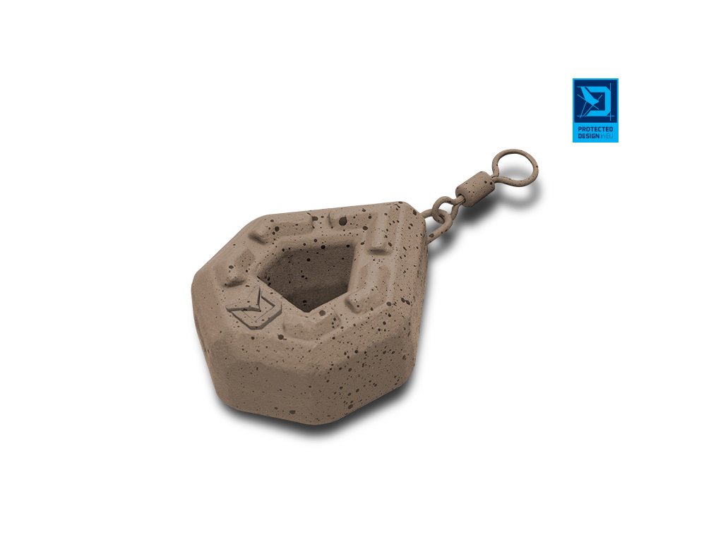 Je inovatívna záťaž dizajnovaná tímom značky Delphin, vhodná pri love na odhod na členitom dne, alebo pri love na tečúcich vodách. Vďaka jedinečnému hranatému tvaru bolo možné vytvoriť kompaktnejšiu záťaž, ktorá má pri menších vonkajších rozmeroch rovnakú hmotnosť ako bežne predávané olová podobného typu. To zaručí výborné nahadzovacie vlastnosti a rýchle klesanie ku dnu. Pre docielenie čo najdlhších a najpresnejších hodov je navyše spodná časť záťaže rozšírená, aby sa tu koncentrovalo viac hmoty a tak predlžuje Vaše hody o ďalšie dôležité metre! Výstupky na hlavných plochách záťaže eliminujú kĺzanie po dne. Otvor v strede záťaže umožňuje rýchlejšie klesanie montáže vodným stĺpcom. Povrch záťaže je chránený farbou v prírodných odtieňoch hnedej s čiernymi fŕkancami, čo dokonale kamufluje jej prítomnosť na dne. Zväčšené očko na obratlíku umožňuje jednoduchšie a rýchlejšie upevnenie záťaže na montáž. PROTECTED DESIGN- Tento produkt bol kompletne navrhnutý dizajnérmi značky Delphin. Jeho dizajn a technické riešenie sú natoľko unikátne, že je registrovaný a chránený na území celej Európskej únie.